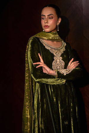 This exquisite olive kalidaar, crafted with meticulous attention to detail, is a testament to timeless elegance. The fitted sleeves and boat neckline accentuate the wearer's silhouette, while the banarsi dupatta adds a touch of opulence. The maruri work on the neck and sleeves further enhances its luxurious appeal, making it a perfect choice for sophisticated occasions.