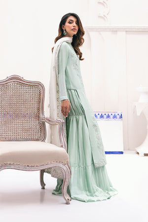 The mint kurta is a blend of elegance and style. It features a narrow shirt with a band collar, fitted sleeves, inwards cut detail on the front and back, ivory and green machine embroidery, and tassels on the sleeve hem and neckline, with moti and kardana touching, creating a sophisticated look. The pleated gharara-style pants in mint are made from raw silk, adding a touch of elegance. The ivory block print dupatta in medium silk completes the ensemble with a graceful finish.