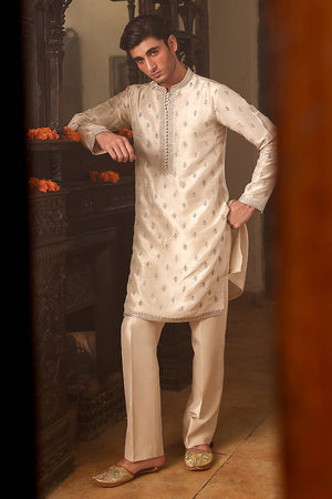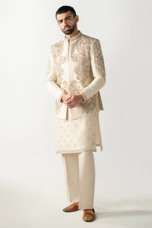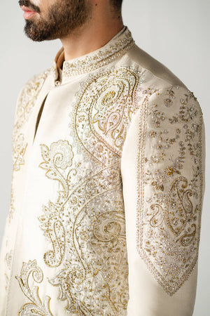 Crafted in luxurious Raw Silk, this Beige Gold Prince Coat set (paired with kurta and trousers) is adorned with Tilla, Badla, and refined Adda work. A majestic ensemble made for the groom who prefers classic opulence for his Nikkah ceremony.