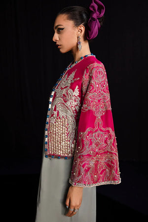 Hawt as pink is named after its extraordinary stylish cropped jacket in raw silk with structured flared sleeves. Fully hand embellished jacket loaded with embellishment details made in pure dabka and nakshi and tila and resham French knots with exclusive navy-coloured stones border. It comes with pleated flowy cut dress in chiffon paired with gold studded boot cut pants in pure Thai silk fabric.