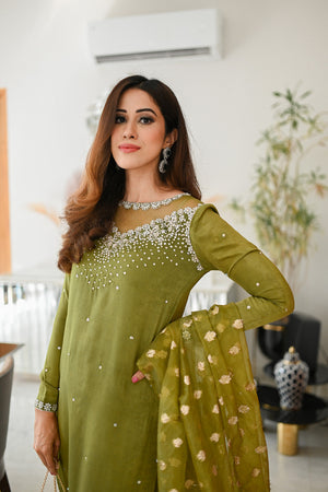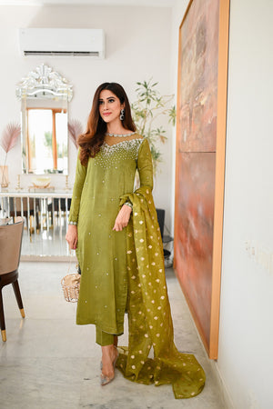 Ayezel features a wondrous hue of lavender playing a soulful symphony. The subtle ensemble features majestic motives of embroidery paired with organza dupatta and pants.