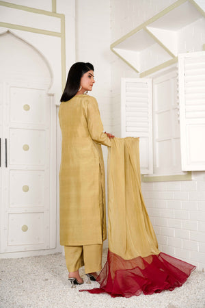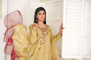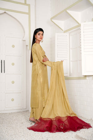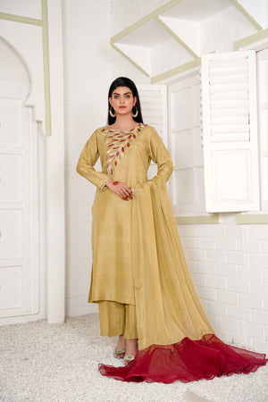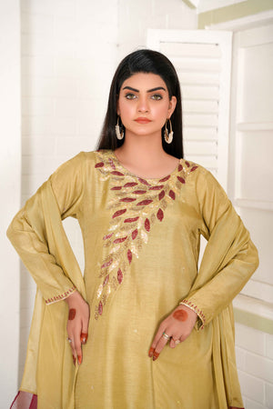 Carved from rich korean silk, this alluring piece showcases artistic embroidery on the neckline and sleeves with sequins spray on front and sleeves. Completed with dupatta and trousers.
