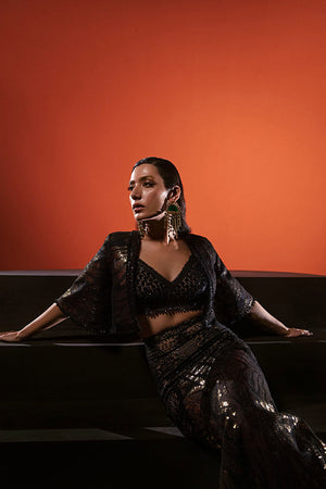 Step into sophistication with our black cheetah luxurious dress, featuring intricate hand-embroidered sequins and crystals arranged in stunning architectural patterns. This 3-piece separate ensemble exudes opulence and style.