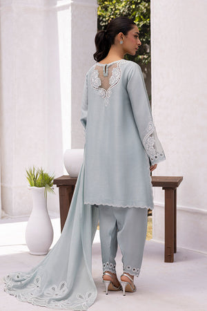 Tinted aqua short shirt made from pure raw silk, paired with a narrow shalwar. The shirt features ivory schiffli embroidery and delicate detailing across the body, with unique organza details along the back and sleeves. The medium-weight silk dupatta is finished with cutwork detailing along the pallu, creating a refined look.