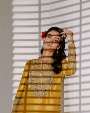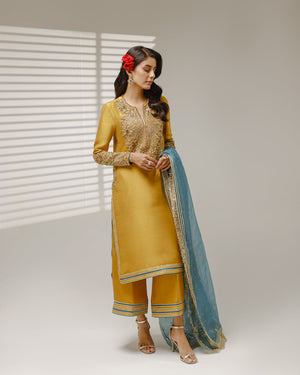 A look that captures the golden essence of the sweetest treasure found in nature that perfectly paired with a vibrant teal dupatta.This captivating combination envelopes you in smooth, silky feel .