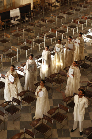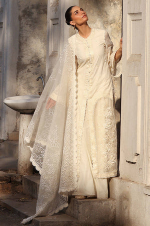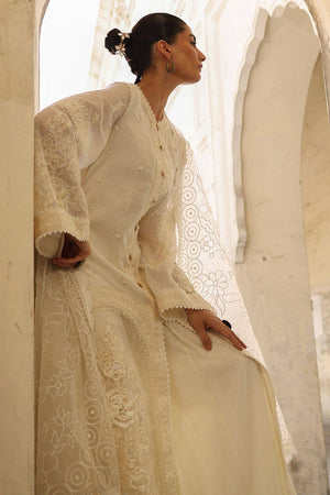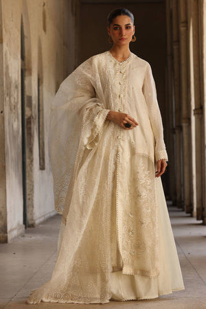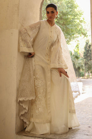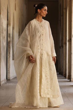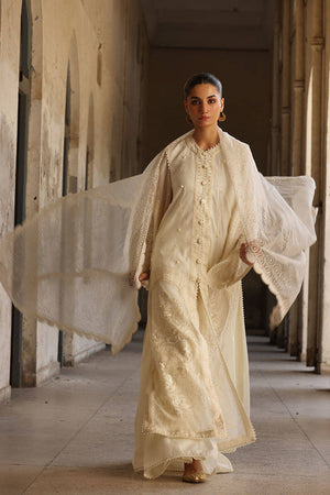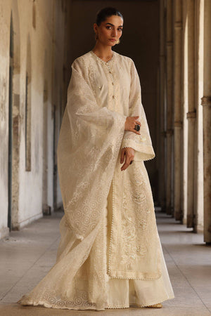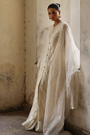 In soft cotton net, this shirt balances floral organza panels with intricate 3D adda work, elevated further by hand-sewn pearl and sequin buttons that gleam with a muted lustre. Decorative trims run along the neckline, hem, and sleeves, creating a cohesive yet romantic structure. The chiffon dupatta is scalloped at the edges and screen-printed with floral vine scrolls on all four corners. Adorned with fine trims throughout and enriched with surface adda work detailing, the look is paired with plain trousers for wispy look perfect for Summer.