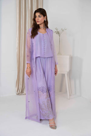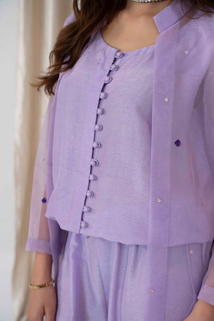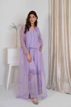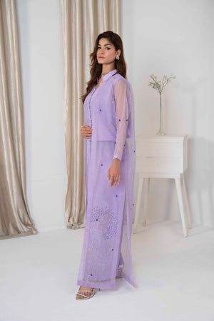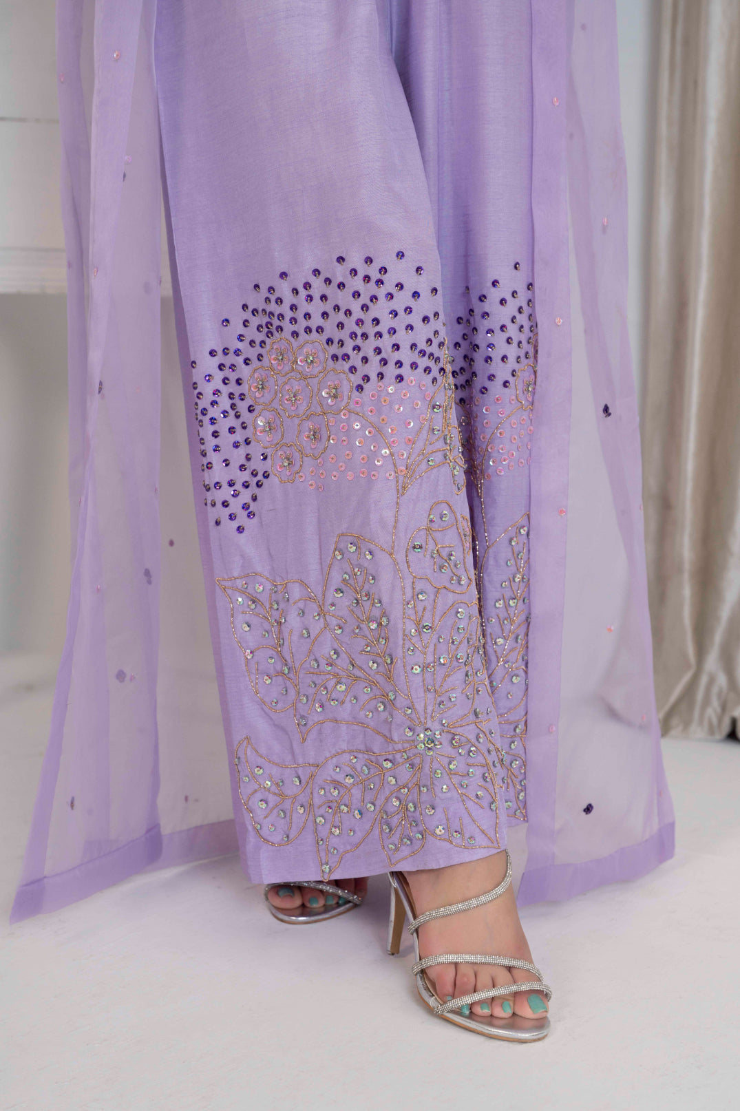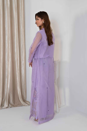 Prepare to captivate in our lilac jumpsuit! Showcasing a stunning floral sequins design on the lower half adding a touch of elegance. The organza gown is also adorned with mesmerizing sequin spray, which gives you a perfect look.
