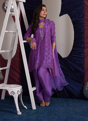 This grape hued three-piece ensemble is a stunning blend of elegance and understated glamour. The shirt, made from pure raw-silk schiffli, features a minimal neckline that is intricately embellished with sparkling diamanté, adding a subtle touch of luxury. The chiffon dupatta is dyed in three beautiful shades of purple, creating a soft, gradient effect that flows effortlessly. It is secured in place with a gorgeous hand-embellished floral motif, trimmed with an organza frill, adding a unique and refined detail to the overall look. The outfit is completed with a loose pure raw-silk shalwar, offering both comfort and sophistication. This ensemble combines contemporary elegance with classic charm, making it an ideal choice for any special occasion.