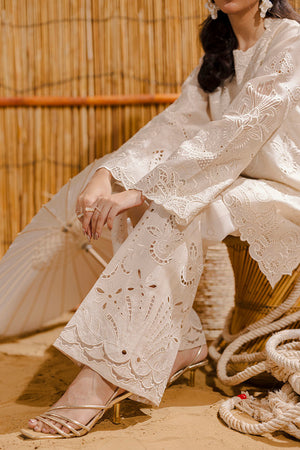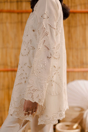 An ivory khaddi silk cord set featuring a cutwork crew neckline and bell sleeves for a balanced blend of structure and fluidity. The bootcut pants are finished with Schiffli embroidery, cutwork, and appliqué detailing, creating depth and texture throughout the ensemble.