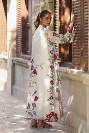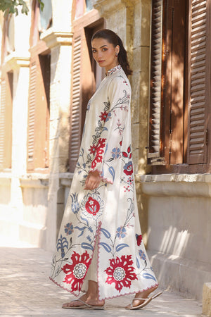 Exuding elegance, a timeless ivory hued khaddi silk kaftan is exquisitely embroidered with intricate appliqué and eyelet accents in periwinkle, crimson, and onyx shades. The keyhole neckline and scalloped bell sleeves add playful sophistication to the elegant silhouette. Paired with matching pure rawsilk trousers.