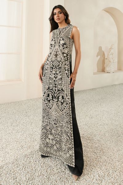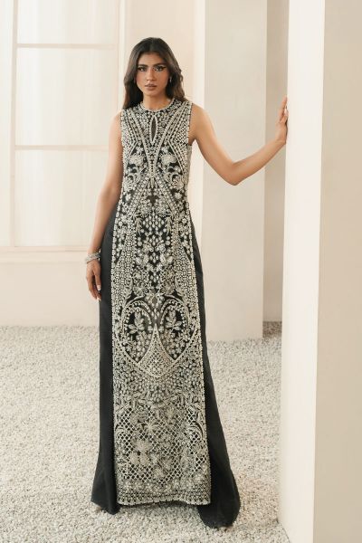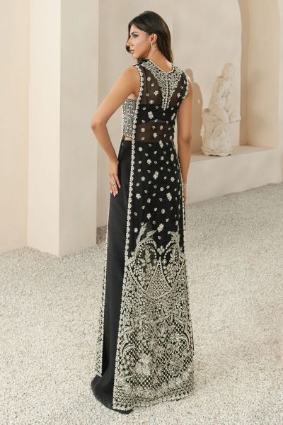 This elegant black ensemble features a modern, tailored long shirt with silver embellishments, blending regal sophistication with contemporary style. The sleek silhouette and metallic accents create a perfect balance of luxury and minimalism. Paired with flattering boot-cut pants, the outfit exudes confidence and timeless grace.