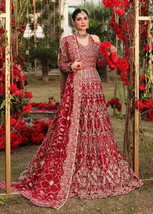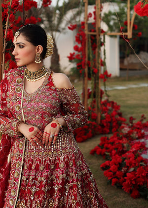 The handcrafted Red peshwas features chevrons derived from sacred geometry, tessellations and various floral motifs meticulously using hand-cut-sequins,pearls crystals, Tilla and stones. The peshwas is paired with the Red structured raw silk Lehngha and composed Dupatta with heavy detailed border and tissue applique.