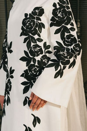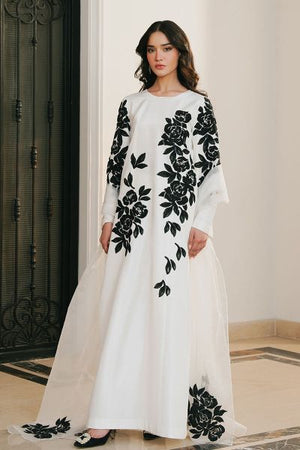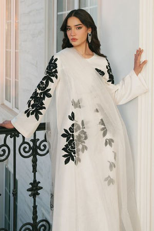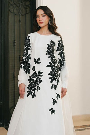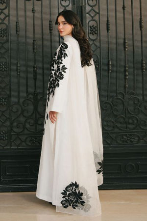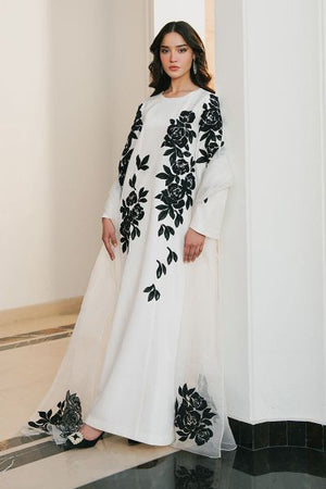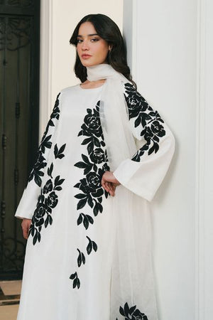 This striking white and black ensemble exudes bold elegance and modern sophistication. The long shirt is adorned with exquisite appliqué work, creating intricate patterns that add texture and depth to the design. The black and white color contrast highlights the craftsmanship, making the outfit both timeless and contemporary. Paired with tailored trousers, the look maintains a sleek and polished silhouette. Draped over the shoulders is a soft organza dupatta , which adds a delicate, airy touch to the overall composition. The flowing fabric and subtle sheen of the dupatta perfectly complement the intricate appliqué details, making this outfit ideal for formal occasions where you want to stand out with effortless grace.