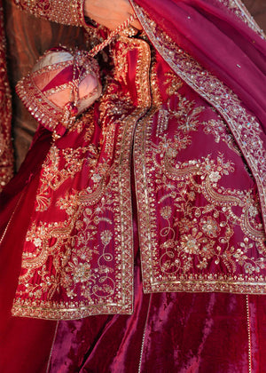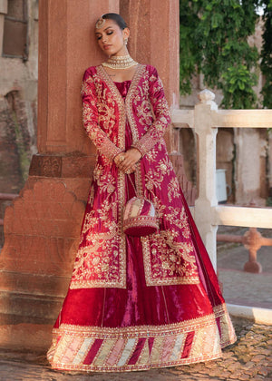 Turn heads in striking style with Inazar, a shocking pink masterpiece that exudes festive glamour. The front-open Korean silk shirt is beautifully detailed with fine ada work and delicate hand embellishments, layered over a plush velvet bustier for a touch of luxe drama. Paired with rich velvet with laser patti lehnga and a kathaan organza dupatta adorned with all-over embroidery, this ensemble is the perfect fusion of bold color, refined craftsmanship, and modern elegance—made to shine at weddings and grand celebrations.