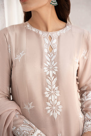 Kalidar kurta in a mocha-toned fabric, constructed with fitted full sleeves and a rounded neckline. White embroidery is applied throughout the body and sleeves, with organza borders in white attached to the sleeve cuffs and the daaman. Paired with a white crushed dhaka in a lightweight fabric. The dupatta is medium-weight silk with small white bootis placed at intervals across the fabric.