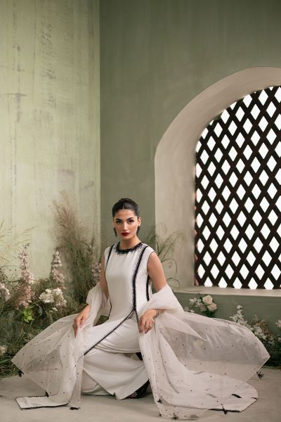 Make a dramatic statement with this striking white and black ink noir long shirt, featuring two daring slits on the front and exquisite cut dana embellishments along the hems and sides. The crew neckline is elevated by intricate cut dana details, adding a touch of sophistication. Paired with a sleek boot-cut dupatta, this ensemble exudes modern glamour. The look is completed by a stunning white dupatta adorned with sparkling crystals and delicate tasselling on the corners, adding a whimsical touch. Perfect for formal events, weddings, or red-carpet appearances.