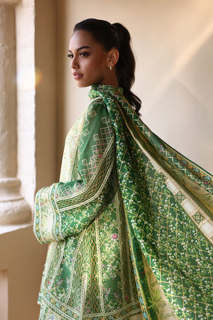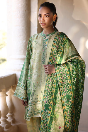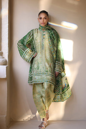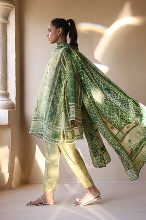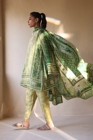 A deep cream and forest green hued cotton net shirt, intricately printed with a symphony of botanical and geometric patterns, radiates timeless allure. Paired with a printed pure rawsilk shalwar complementing the short shirt for a flattering silhouette. The ensemble is elevated by a flowing medium silk dupatta, bordered with intricate patterns and soft floral accents in matching tones.