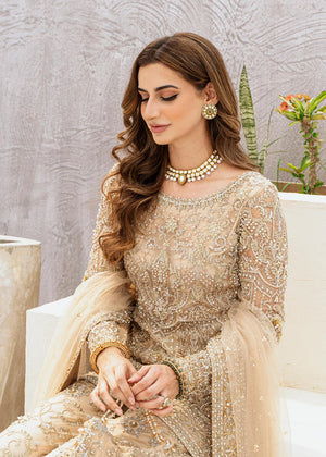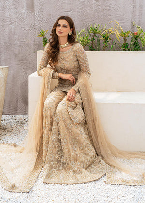 An elegant rhyme to tradition, “Irene” is creating aesthetical magic with its eye catching hues of nude. This outfit is a combination of classic charm and contemporary beauty. The net shirt is beautifully embellished with sprout of gold embellishments. It is paired with embellished net sharara pants. The heavy embellishments on border of dupatta with pearls and sitara spray complete the modern, contemporary ensemble.