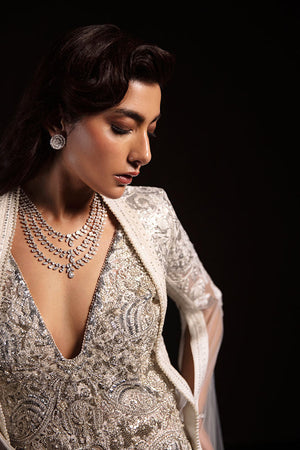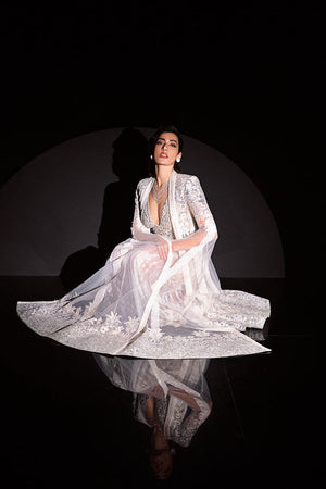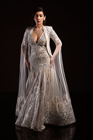 Radiant as the stars, exquisite as the pearls, behold the dress that glistens with Swarovski crystals and delicately handcrafted silk threads, a masterpiece that drips with elegance and glamour like dewdrops on a fine French mesh - a sight to leave you breathless!"
