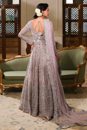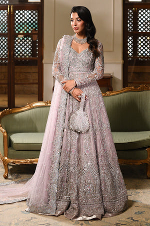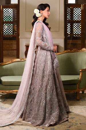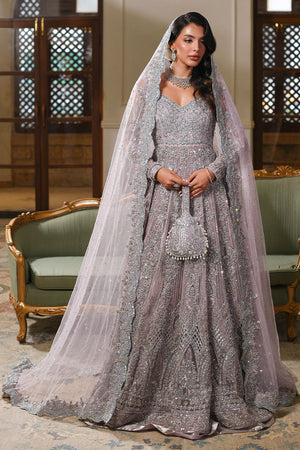 An ethereal lilac reception bridal that exudes elegance and grace. The floor-length stiff net gown is designed with fitted sleeves and a flattering V-neckline, elevated with delicate cutwork detailing on both the sleeves and gown panels. The ensemble is brought to life with exquisite silver embellishments—dabka, nakshi, sitara, moti, pearls, cutdana, and tiki stones—intertwined with soft lilac resham for a harmonious play of shimmer and subtle color. Paired with a plain lamé lehenga that balances the intricacy of the gown, the look is completed with a stiff net dupatta, finished with an intricate cutwork border that adds refinement and poise to the overall silhouette.
