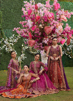 A striking blend of regal tones and traditional craftsmanship, this deep magenta kalidaar set is designed to make a statement at any celebration. The front-open kalidaar features a rich raspberry pink hue, with a bodice and sleeves crafted from luxurious charmuese silk adorned with classic block printing. The gracefully flowing kalidaar panels are made of pure net, detailed with block print borders and a delicate sequins spray, adding depth and fluidity to the silhouette. The ensemble is paired with a gold zari lehenga, beautifully finished with contrasting block print borders in antique tones, offering a perfect balance of elegance and opulence. Completing the look is a net dupatta with an all-over sequins spray, framed with intricately detailed heavy block print borders on all four sides. Accents of gold, antique bronze, and subtle hints of deep maroon run throughout the embroidery, enhancing the richness of the overall design.