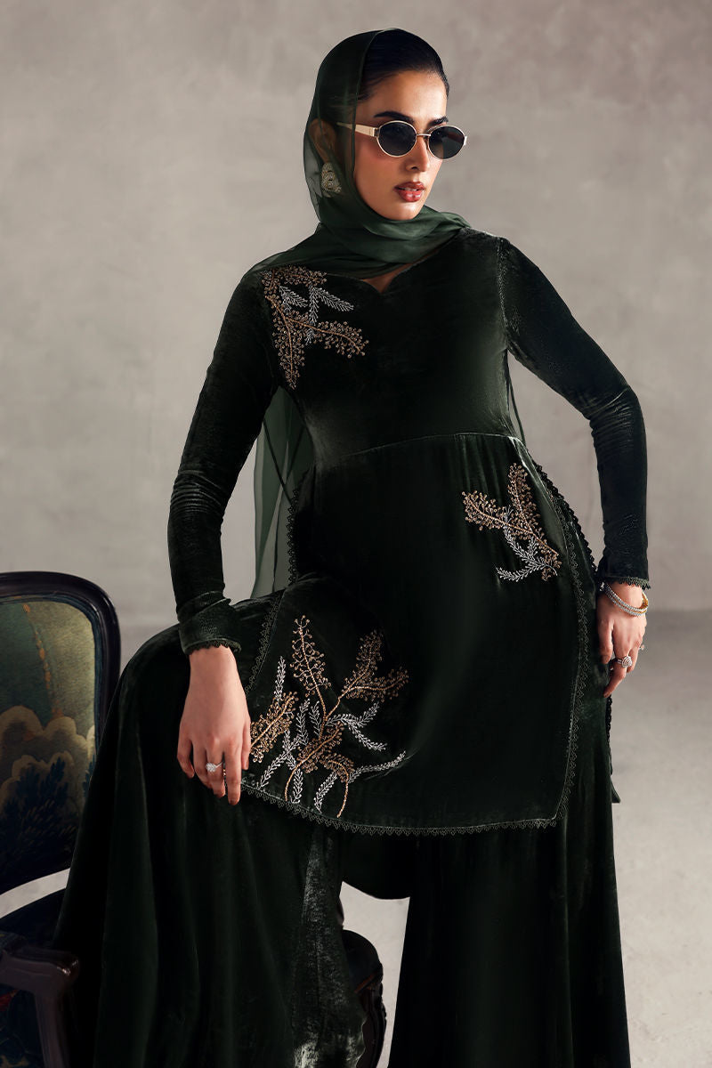 An exquisite olive green outfit featuring a pure velvet shirt paired with a matching pure velvet sharara for a regal appeal. The ensemble is complemented by a pure organza dupatta, adding a delicate and graceful contrast to the rich velvet texture.