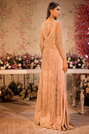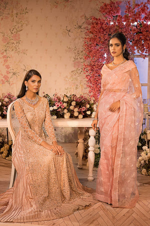 Live your bridal fantasy in our dusty pink bridal ensemble. The gown is made of pure net with a top layer of hand work of cut dana, beads and crystals where as the inner layer is made of pure raw silk with pleats to give depth to the gown.