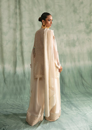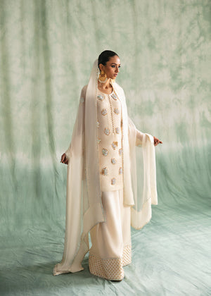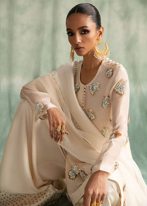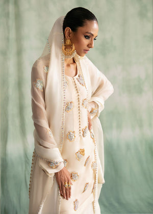Ivory elegance radiates utter grace and class; this 3 piece ensemble consists of a short pure rawsilk shirt with intricately handworked 3D motifs, pure flared shalwar with sequinced detailing and a crystalised chiffon dupatta to complete the look.