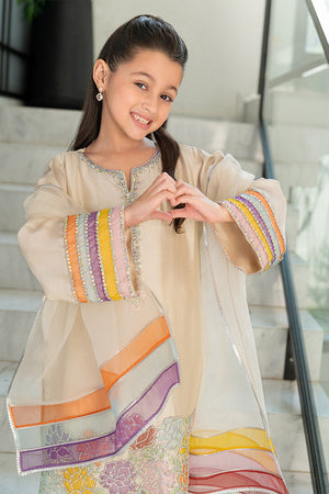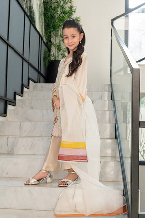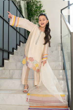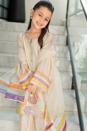 This elegant ivory ensemble is crafted from pure sheesha silk for both the shirt and wide-leg pants, radiating sophistication and grace. Paired with a delicate organza dupatta, the look is elevated with contrast color patches, adding a subtle yet striking hint of color. The neckline is hand-embellished with sequins and crystals, creating a refined shimmer. A signature colorful rosette motif on the dress border makes a bold statement, while the sleeves feature color-block patches lined with stones, adding a contemporary twist to this timeless design.
