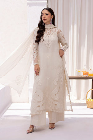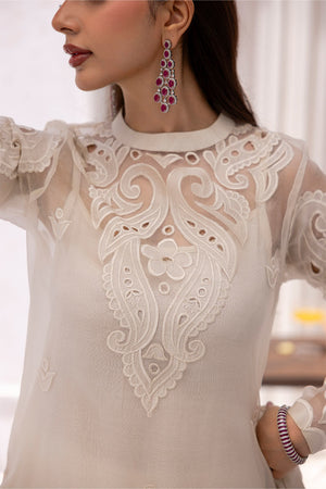 Ivory organza long kurta with self-colored khaddi silk appliqué placed in paisley shapes along the front and sides. The appliqué features thread detailing with cutwork techniques used within the motifs. Floor-length wide-leg pants in matching ivory are paired underneath. The dupatta is made from medium silk and finished with organza bootis throughout, with larger paisley-style appliqué motifs added to both ends of the pallu.