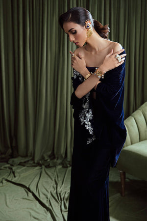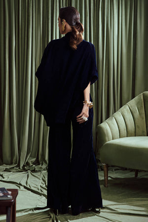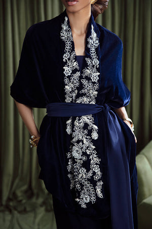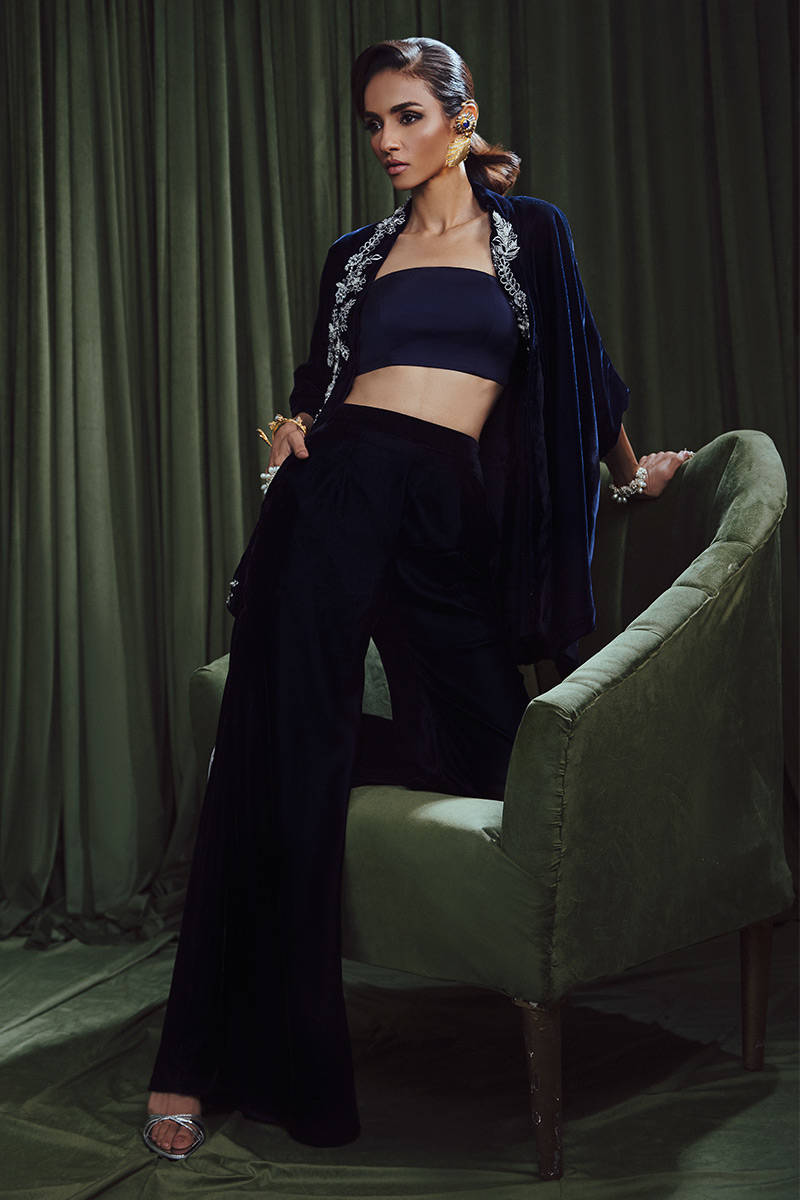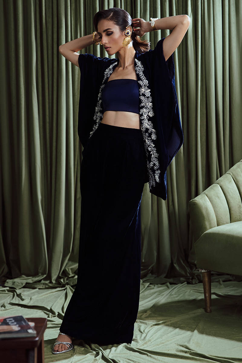 A navy blue embellished wrap paired with velvet plazo pants and slip, completed with blue belt.