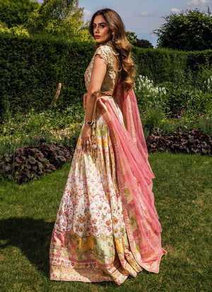 Radiate joy in Izel, a celebration of light, color, and tradition reimagined. This ivory lehenga choli bursts with the vibrant spirit of summer, brought to life through playful yet elegant accents of pink, kiwi green, and sunshine yellow. The design draws inspiration from classic chintz patterns - floral, detailed, and endlessly graceful - woven into every fold of the flowing lehenga.