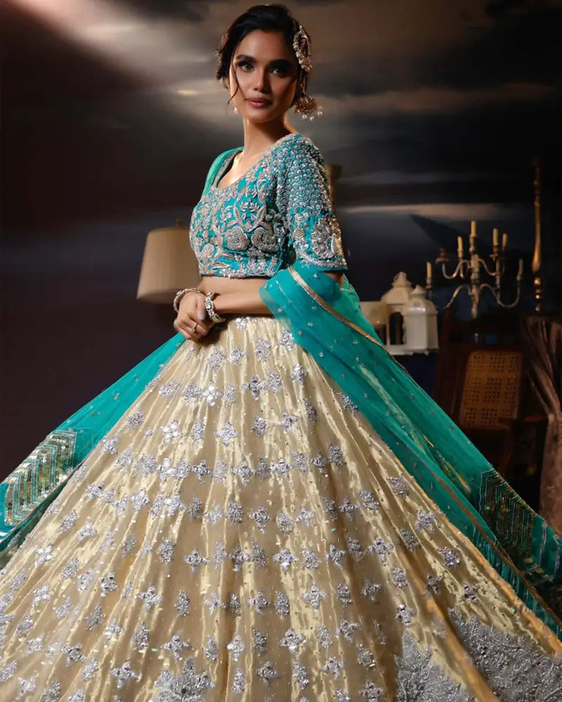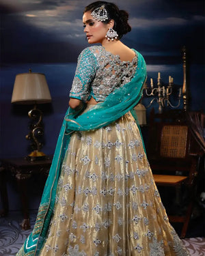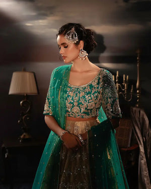 Deep peacock green embellished choli with peacock motifs on sleeves enhanced with an intricate cutwork on back. Paired with gold lame lehanga with swarovski cladded cutwork motifs & border. Hand embelished & Emroidered organza/net duppata.