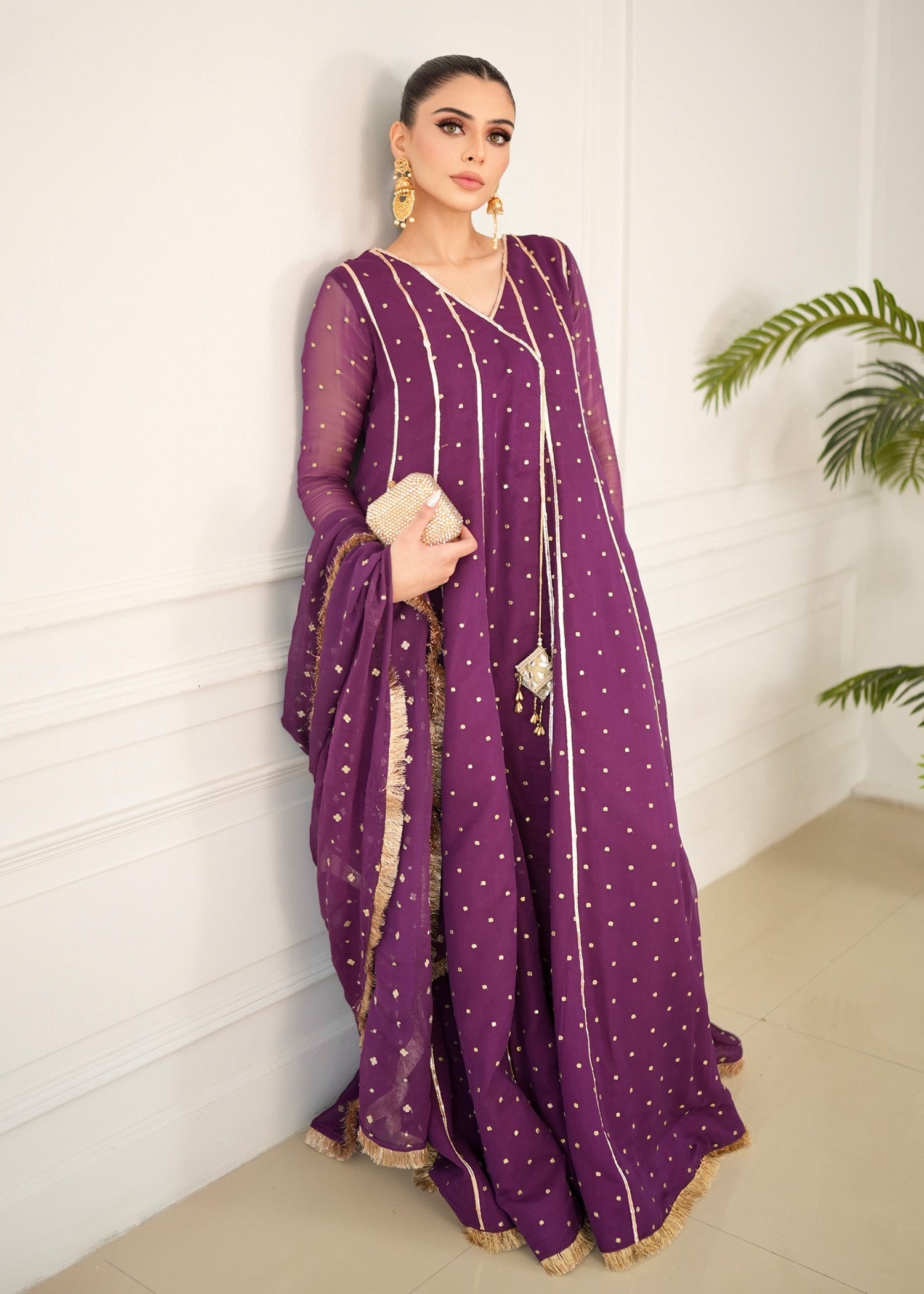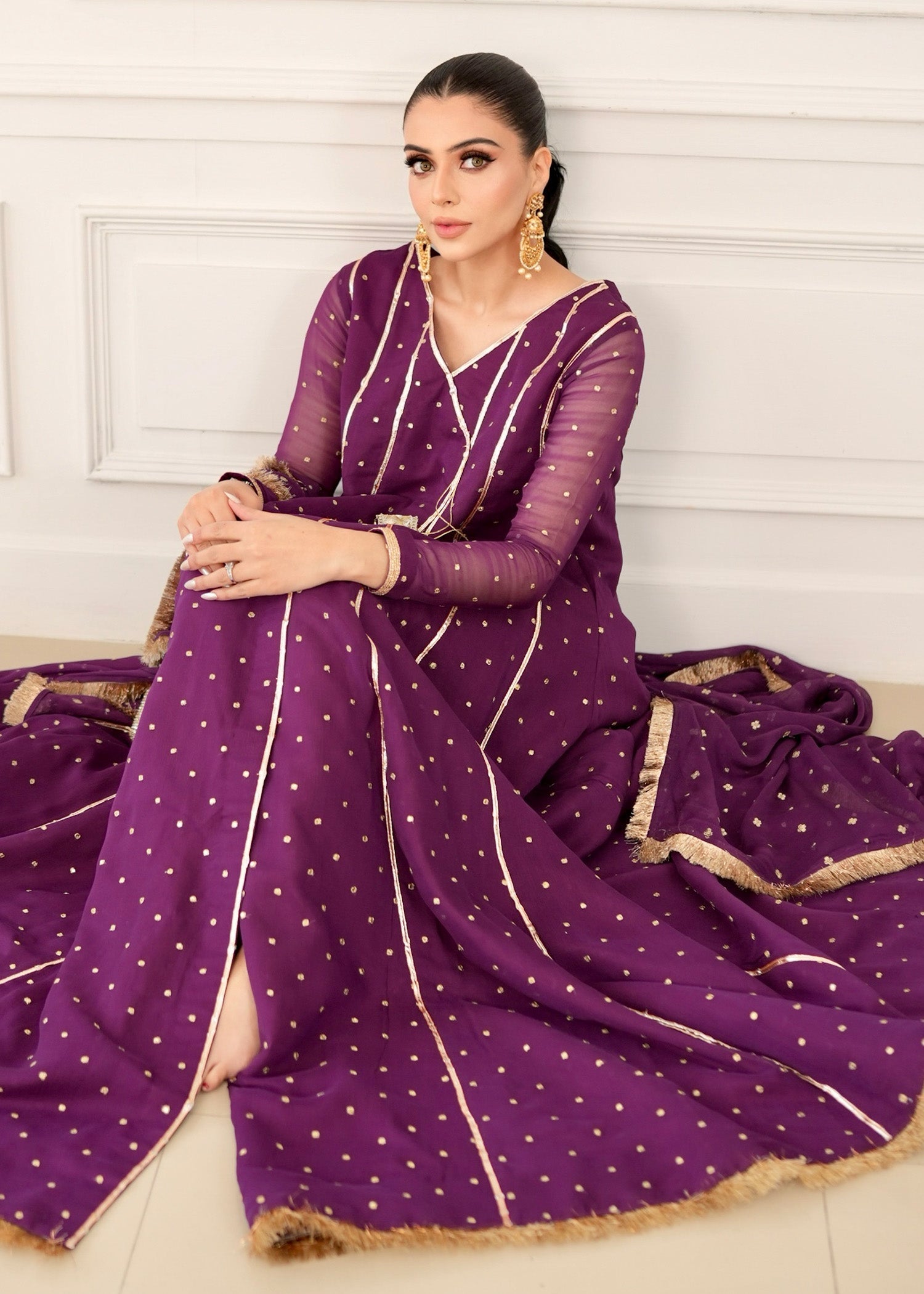 Showcasing a regal silhouette, Izzah enthrals with its vivid plum hue. Blending artisanal elements of Sequin and tilla. This piece includes an Chiffon embroidered dupatta and fitted pants. This piece will add a touch of regality to all your special festivities.- SHIRT LENGTH: 58'