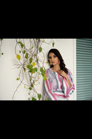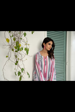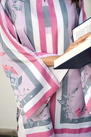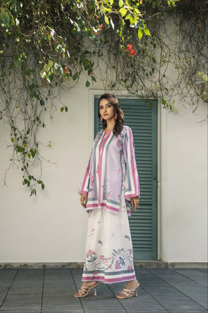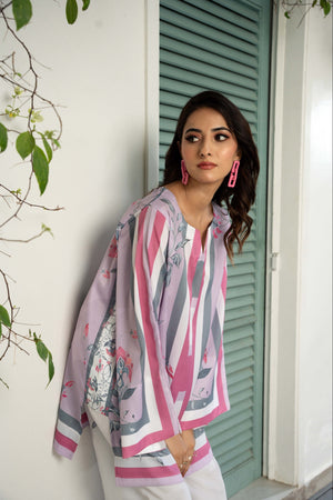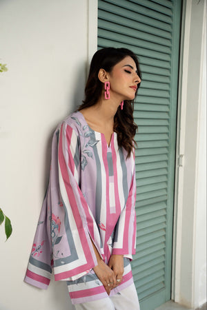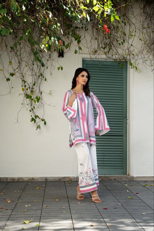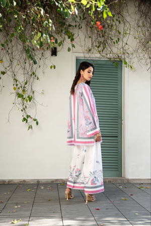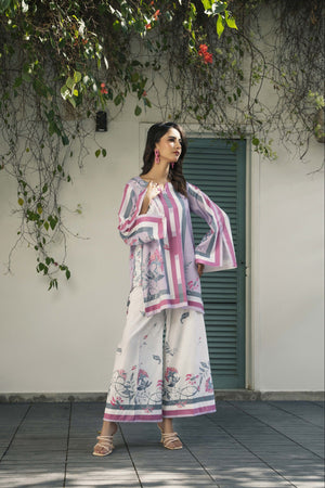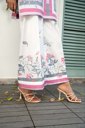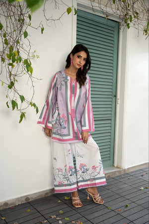 IRA - Luxury Printed Co-ords: Effortless luxury meets contemporary style with our short shirt with slit sleeves paired with ivory culottes, expertly crafted from crepe silk. This set features print inspired by nature, designed in calming hues that invite a minimalist styling approach. Elevate your wardrobe with this versatile ensemble, perfect for sunny days and leisurely adventures.