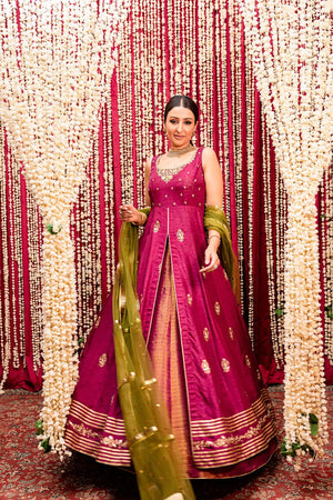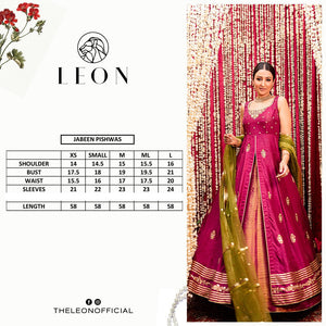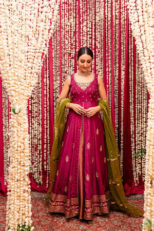Jabeen is a skilfully crafted magenta silk kalidar open Pishwas with exquisite embellishments all over, the bodice and neckline has naqshi, betki and Swarovski work over block printing. The open Pishwas is an elegant floor length style with absolutely dazzling border to finish the look.
