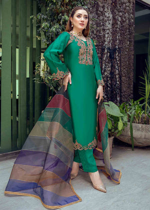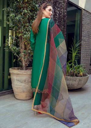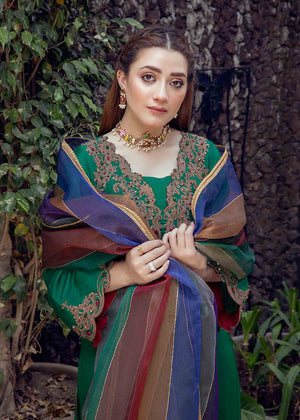 Description: Be an emerald rouge in our pure tissue organza shirt and trouser. Floral cutwork neckline, mid-flare sleeves and shirt border are adorned with dori hand-work to add gracious element of royalty to the look. Paired with our multi-toned ralli style organza dupatta, impressioned with contrasting delicate gold-patti border.