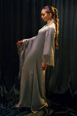 A head-turning silk jade kaftan with tasseled sleeves and a heavy embellished motif for neck.Shirt length: 58 one side off shoulder