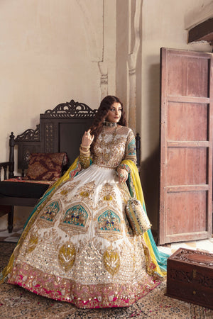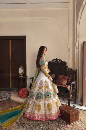 This beautiful dress "Jahanara" so perfectly defines elegance and grace. The marvelous golden tila and sequinned details all over the dress, with the colorful printed patches make this a perfectly refined lehenga choli outfit, ideal for this season's needs and occasions. It represents the vitality of the summer season and gives off a joyous and wonderful vibe of its own.