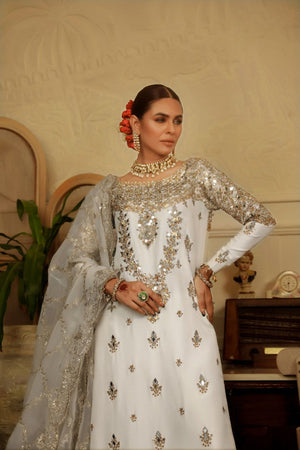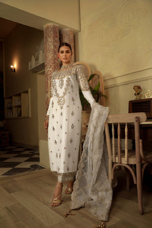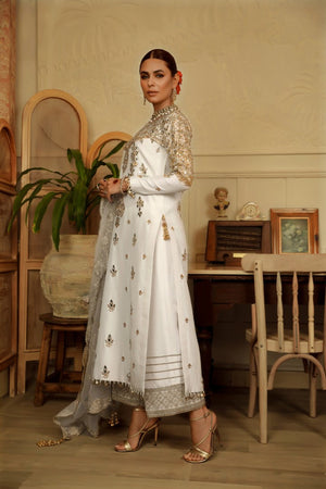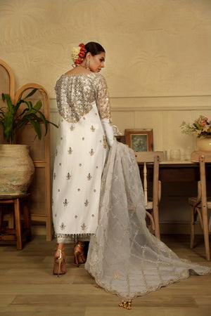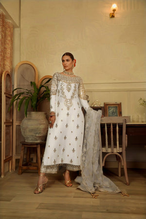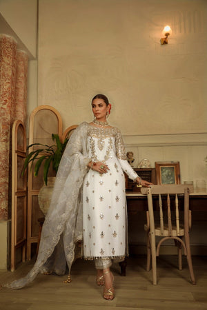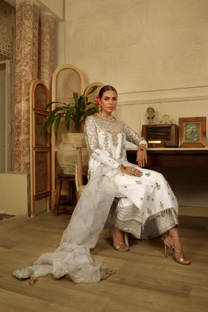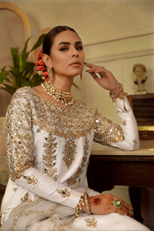 This ivory and gold festive dress is the perfect way to celebrate any special occasion. The mirror work, sequins, pearls, and stones add a touch of elegance to the simple design, making it perfect for your occasion.