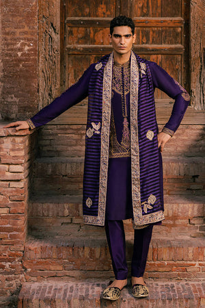 Ensemble ‘Jahangir’ from the 'Raag Darbari' collection, in a regal shade of imperial plum, is a tribute to the opulence of the Mughal era. The raw silk kurta and trousers are adorned with resham thread embroidery in complementing hues, along with baddla metallic accents that depict elongated paisleys and intricate jharoka patterns. The embroidery extends across the chest and sleeves, while the self-organza shawl, embellished with block-printed Mughal motifs and kachi embroidery, completes this ensemble.