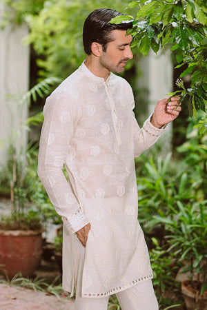 Aimal wears Jal. An ivory ceremonial set featuring a karandi kurta with embroidered pani neckline, sleeves and hem. Paired with an extensively hand embroidered waistcoat that glistens in sheeshagari embroideriesThe shipping charges for all articles barring Bridals are as follows: