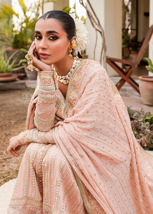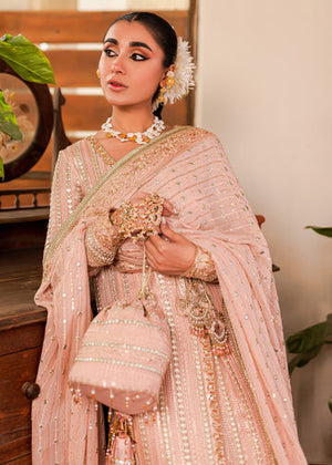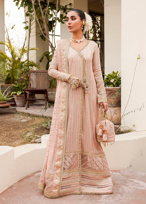 A delicately crafted and embellished angrakha long gown in a soft blush colour enhances the sprinkling of panni all over. It is perfectly complimented with add-on borders and donned with a chikankari dupatta. Tassels crafted by hand are added to the angrakha to complete the aesthetic. A classic outfit that will create a visually enchanting evening look!