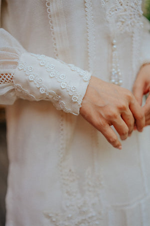 Jasmine features an ivory canvas made from pure chiffon jacquard fabric with attached lining. It has been accentuated with thread embroidery and hand crafted beaded embellishments on neckline; and puff sleevs with lace insertion. It has been paired with rawsilk dhaka pants.