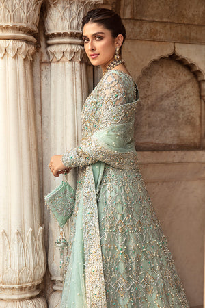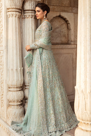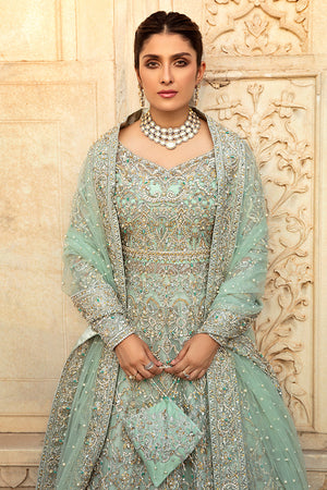 An ethereal and feminine couture look, Jenan consists of a mint hued net gown, adorned with dabka, crystals, pearls, and sequins. Paired with a mint jamavar lehnga, with embellishment on the border. The look is completed with net dupatta with glinting four sided embellished border.