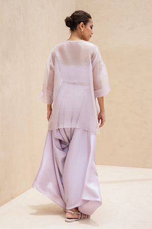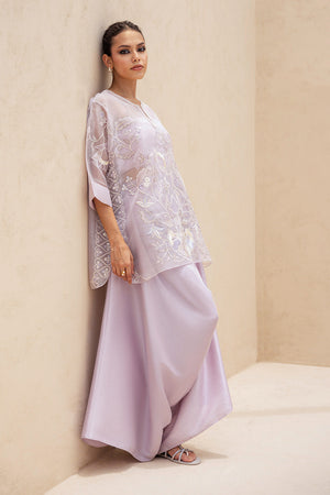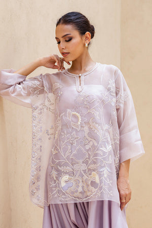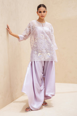 An ethereal ensemble in a soft moonlit lilac hue. The sheer organza shirt, cut in a relaxed silhouette, is adorned with tonal resham florals and delicate thread vines, finished with subtle fabric manipulation along the neckline and a pearl closure. Paired with a matching pure raw silk tube top and voluminous box cut shalwar that drapes like liquid silk, the look radiates contemporary grace.