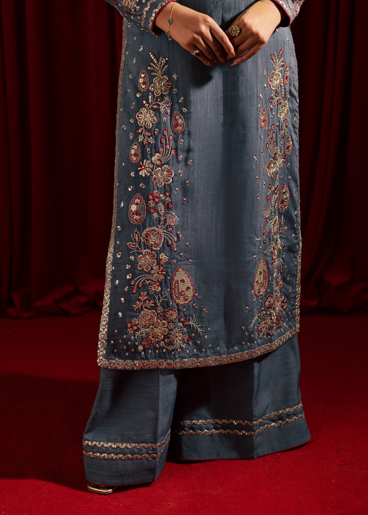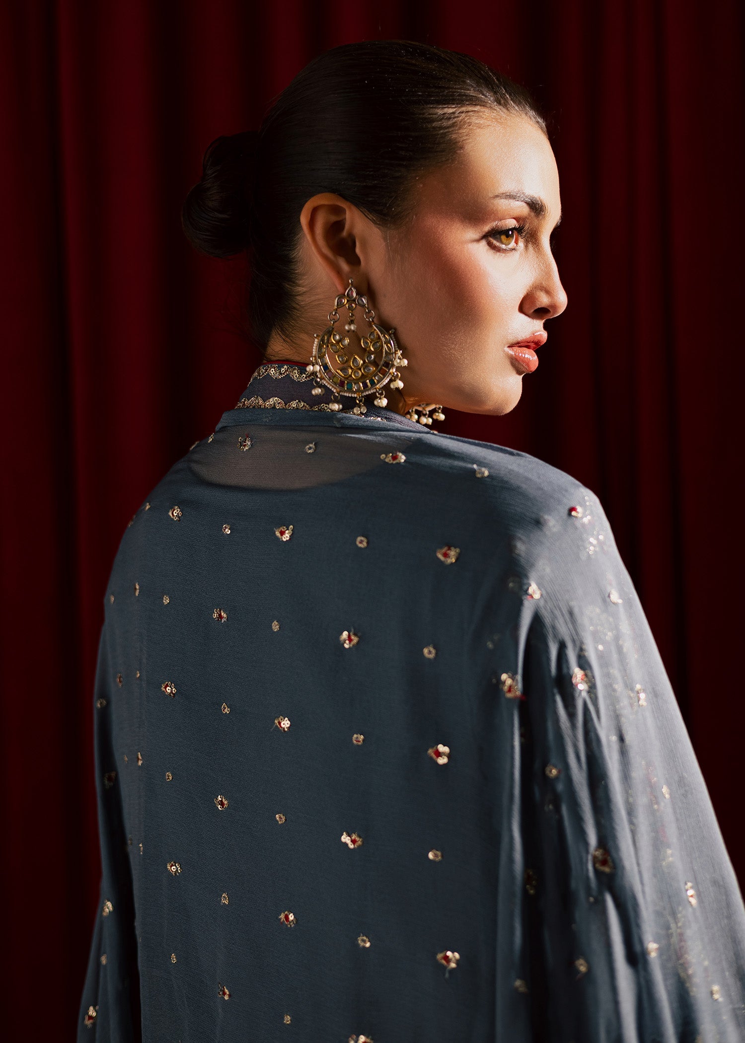 An exquisite affair of Grey and Maroon, the sleekness of long raw silk shirt adorned with floral embroidery and hand embellished details on neckline and sparkle from shoulder to ankle. It is paired with sharara pants which consists of embroidered and sequin border and a chiffon dupatta with close chan and border all around the hem. This outfit is both elegant and beautiful, making you feel like a true fashion icon.