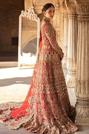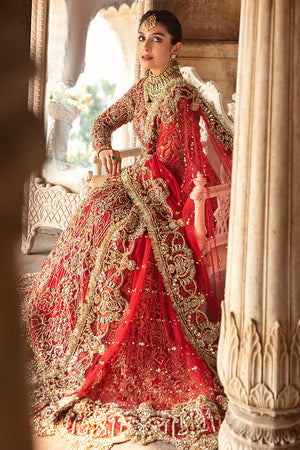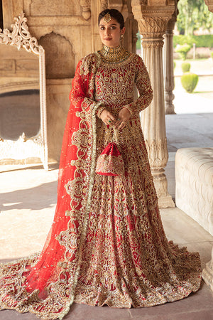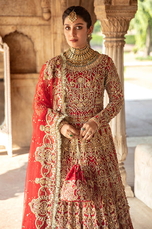 The classic red bridal, Jhomar featuring a beautiful hand crafted net gown with embellishments in gold and silver. It is accompanied with a net dupatta with heavily adorned border, and heavier embellishment on the pallu, with large scallops.