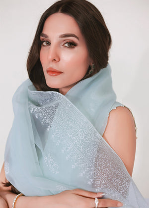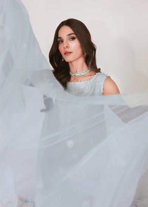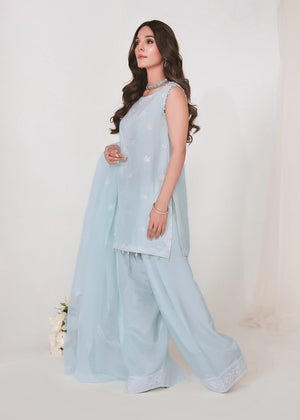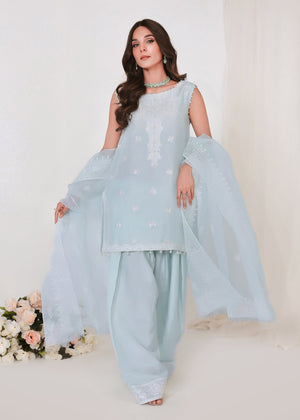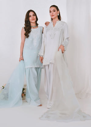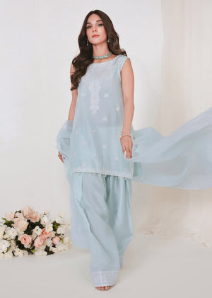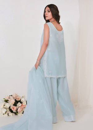 Introducing Jiya from the Misha Collection '24 by Reema Ahsan Bridal Lounge, an exquisite 3-piece ensemble that embodies the essence of luxury clothing. Crafted from pure raw silk, this outfit features a beautifully embroidered short shirt, skinny shalwar, and an elegant organza dupatta. The ice blue color adds a refreshing touch, perfect for summer celebrations. Designed with meticulous attention to detail, this outfit seamlessly blends traditional craftsmanship with contemporary style, making it a standout piece in your wardrobe.