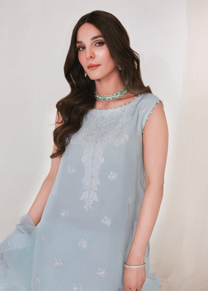 Embrace the allure of luxury clothing with the Jiya ensemble from our Misha Collection '24. This 3-piece set, featuring a pure raw silk shirt and skinny shalwar, offers an unparalleled blend of comfort and elegance. The short shirt, adorned with a constellation of embroidery, showcases the rich heritage of Pakistani dress design while providing a modern twist with its ice blue hue. The loose bottom shalwar adds a touch of contemporary flair, making this outfit perfect for any stylish occasion.